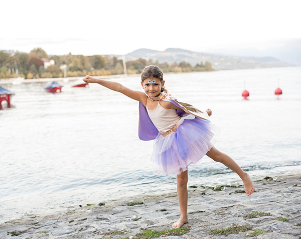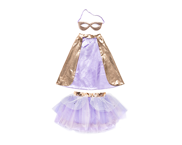 Elegante tutú en tonos oro rosa y lila con capa y máscara a juego. Un set ideal para fomentar la imaginación.