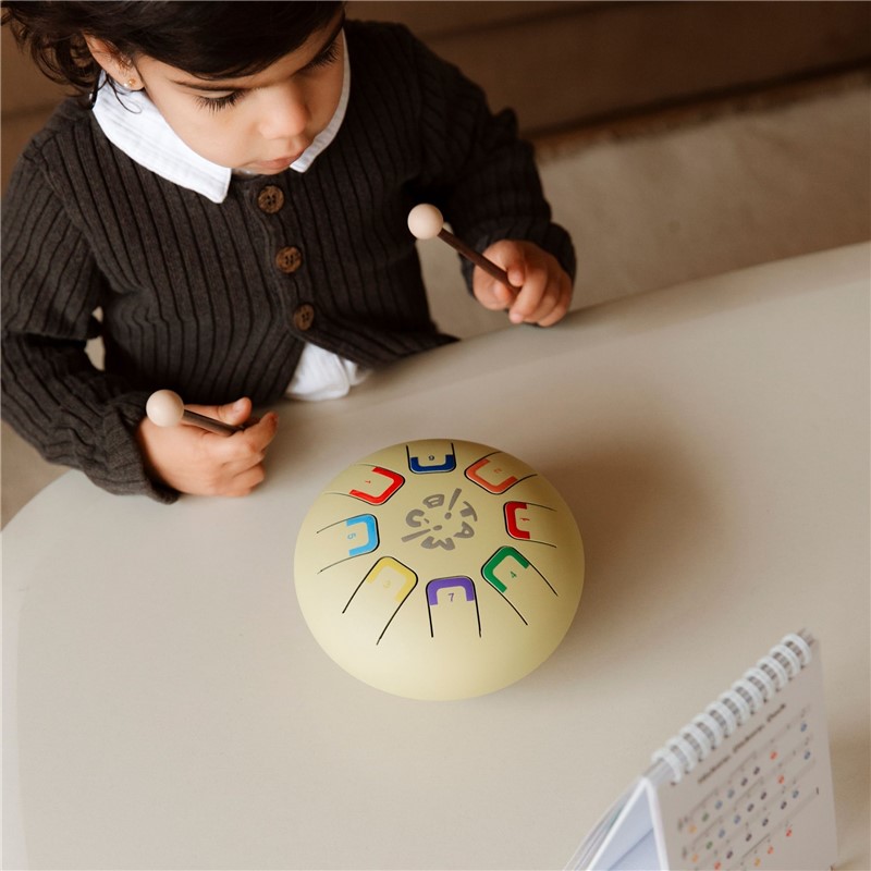 Cuenta con 8 notas diferenciadas por colores y números, lo que facilita su uso y aprendizaje. Cada nota emite un sonido armónico y relajante que puede tocarse de distintas formas: con baquetas, con las manos o con púas de dedos, generando distintas intensidades y experiencias sonoras.